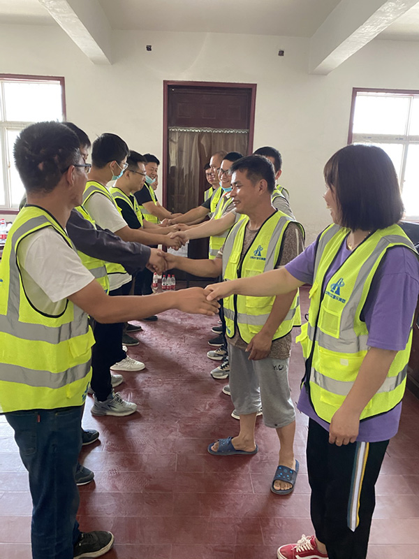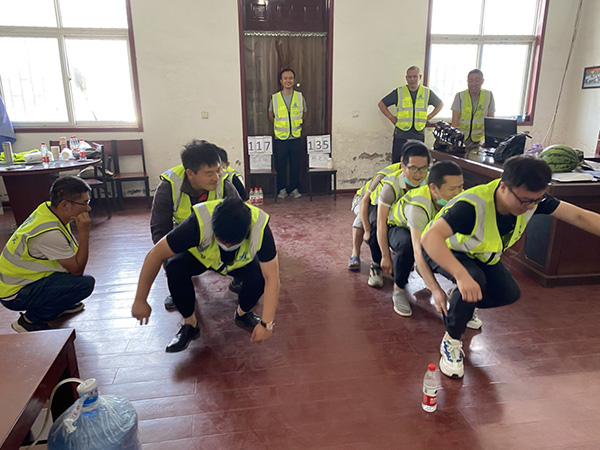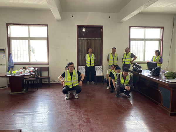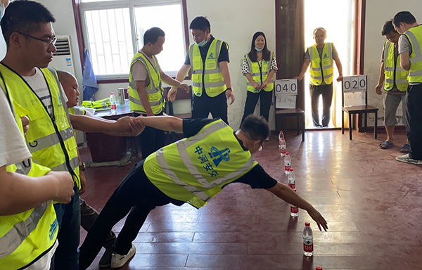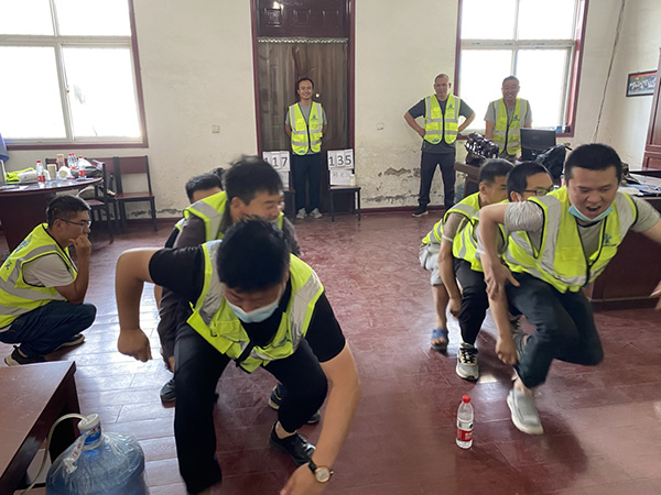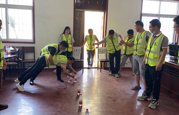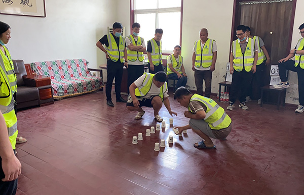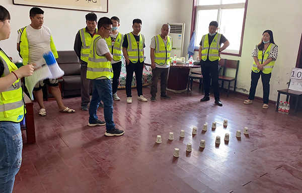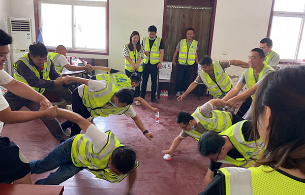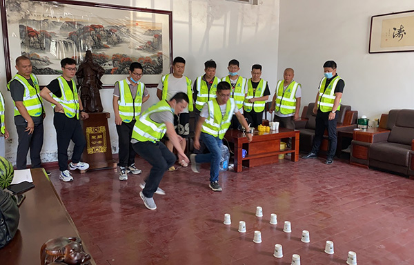 經過一路的奔波,到達項目后,首先開啟破冰模式。總部全體人員給項目員工互道辛苦,互作介紹,在第 一時間進行了互相了解。活動從“隔空傳紙”的互動開啟,成員按原有編隊,開啟第 一輪PK,過后開啟了團隊重建,沖破原有團隊壁壘,開啟游戲環節。